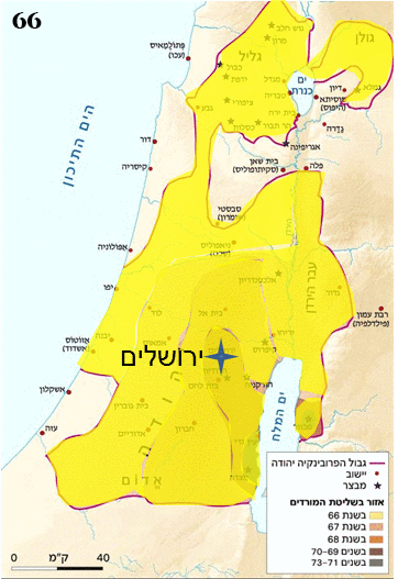 עם כשלונו של גאלוס בדיכוי המרד, יצא המצביא הרומי אספסינוס, בלוויית בנו טיטוס, שהיה מצביא בפני עצמו, לדכא את המרד ביהודה. אספסינוס הצליח להתקדם בדיכוי המרד. במפה משמאל, ניתן לראות בצהוב את השטח שהיה בשליטת המורדים, וצמצומו בידי אספסינוס.