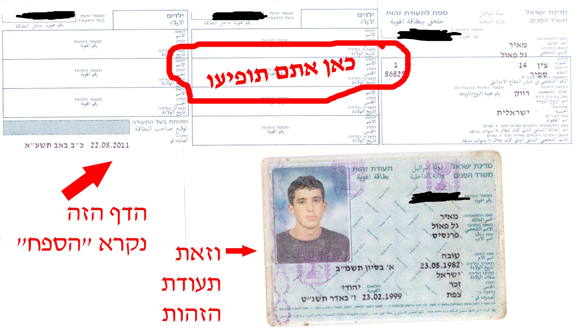 3. לצלם מאחד ההורים את תעודת הזהות שלו ואת הספח. הספח זה המקום בו אתם רשומים כילדים. לדוגמה: